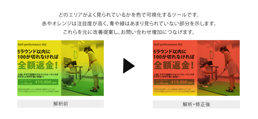 ヒートマップはどのエリアがよく見られているかを色で可視化するツールです。赤やオレンジは注目度が高く、青や緑はあまり見られていない部分を示します。これらを元に改善提案し、お問合せ増加につなげます。