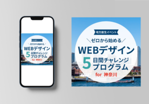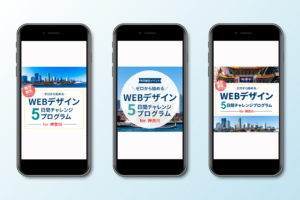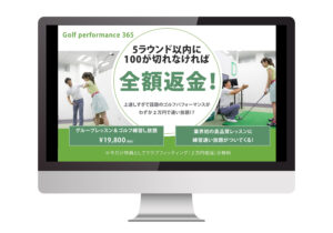 実際の練習風景やレッスンシーンの写真を使用し、スタジオの雰囲気や安心感が伝わる構成にしました。さらに、「5ラウンド以内に100が切れなければ全額返金」という強みがより目立つ様に中央に配置し、視線誘導も意識し強調しています。